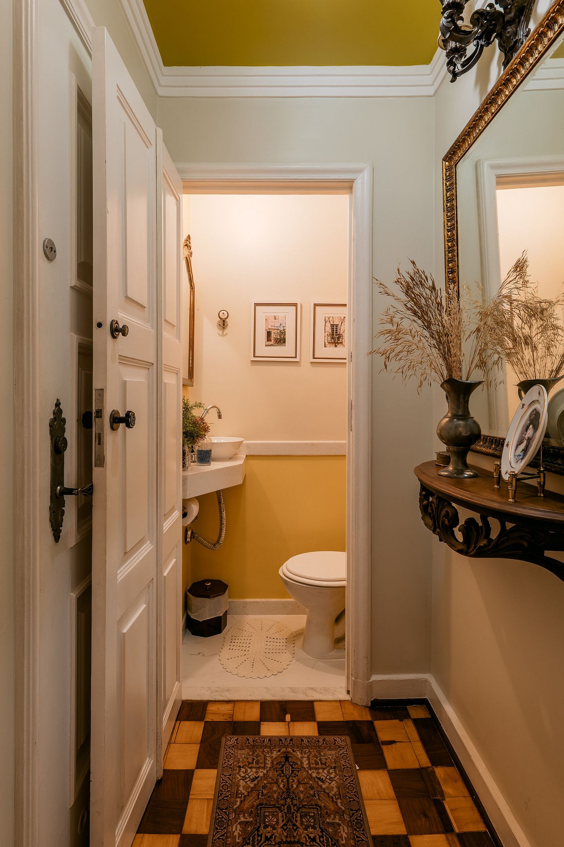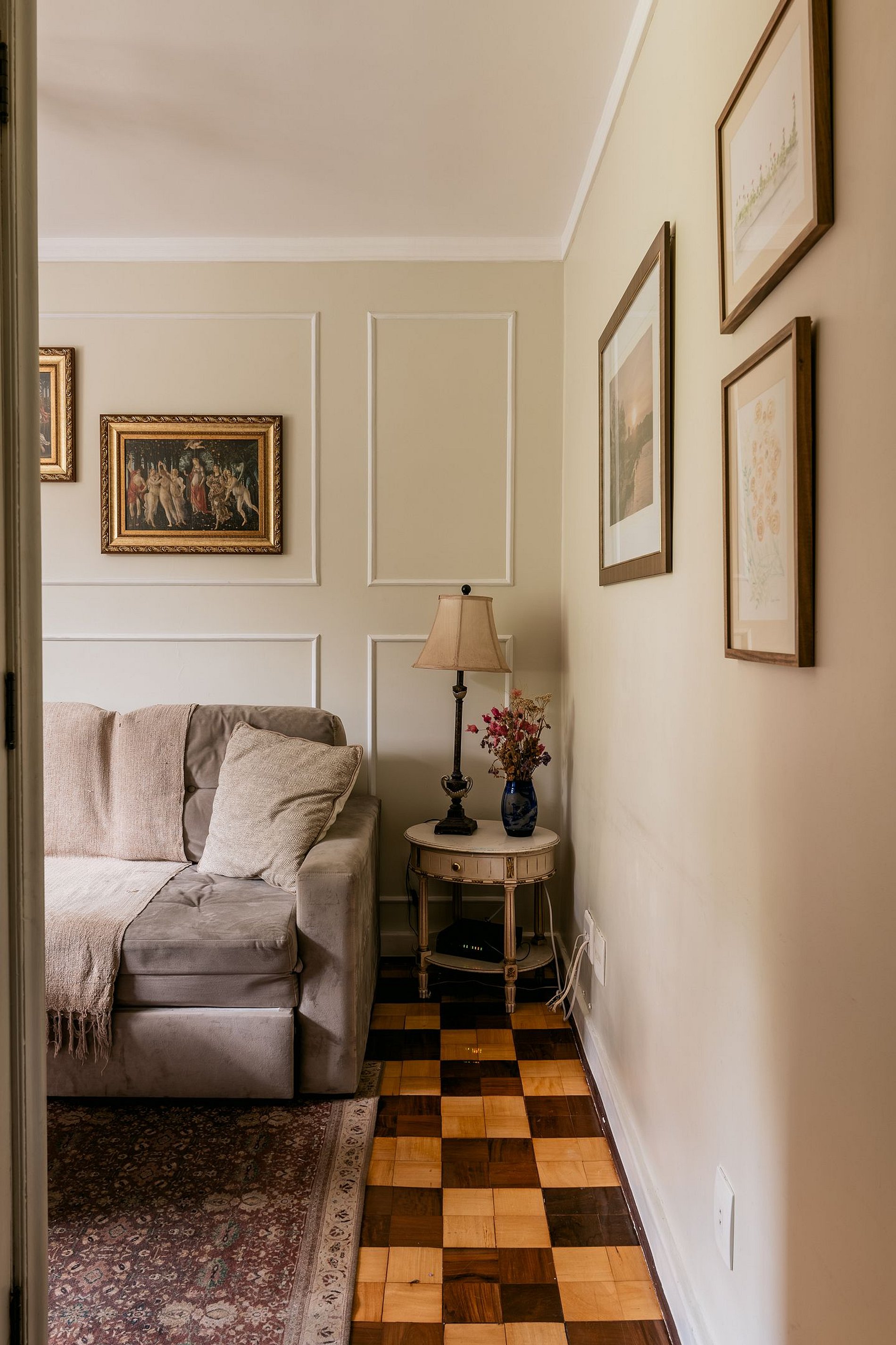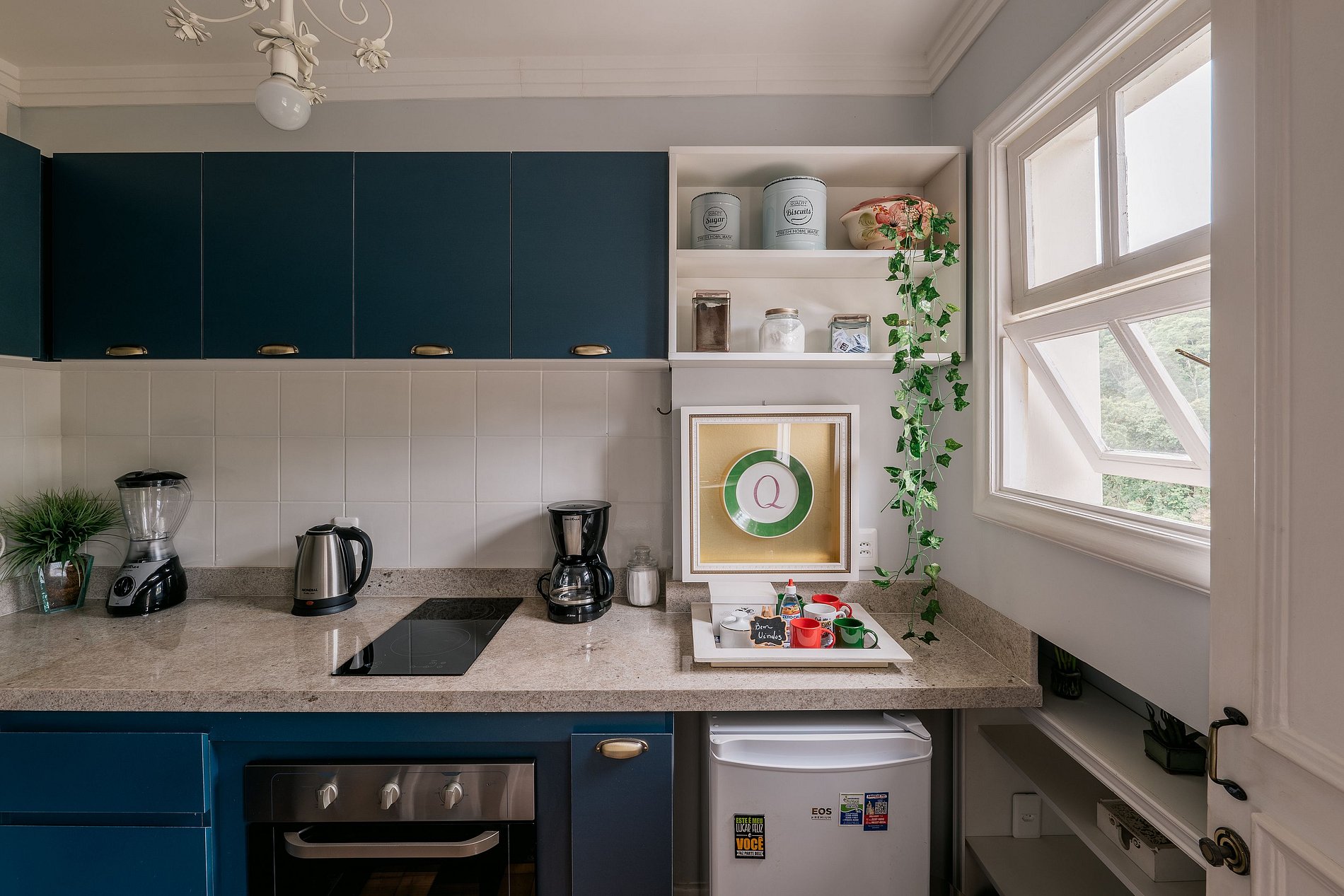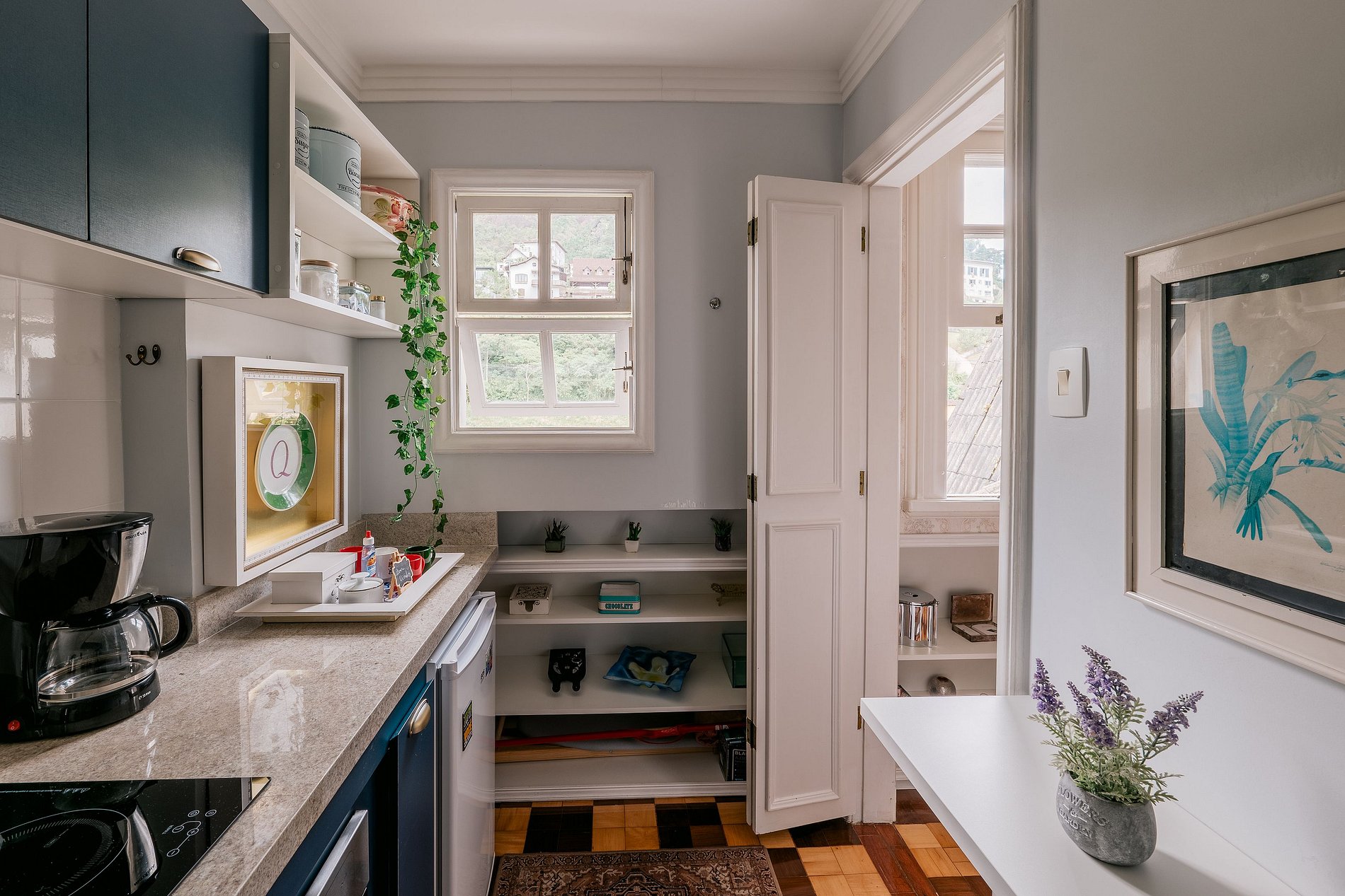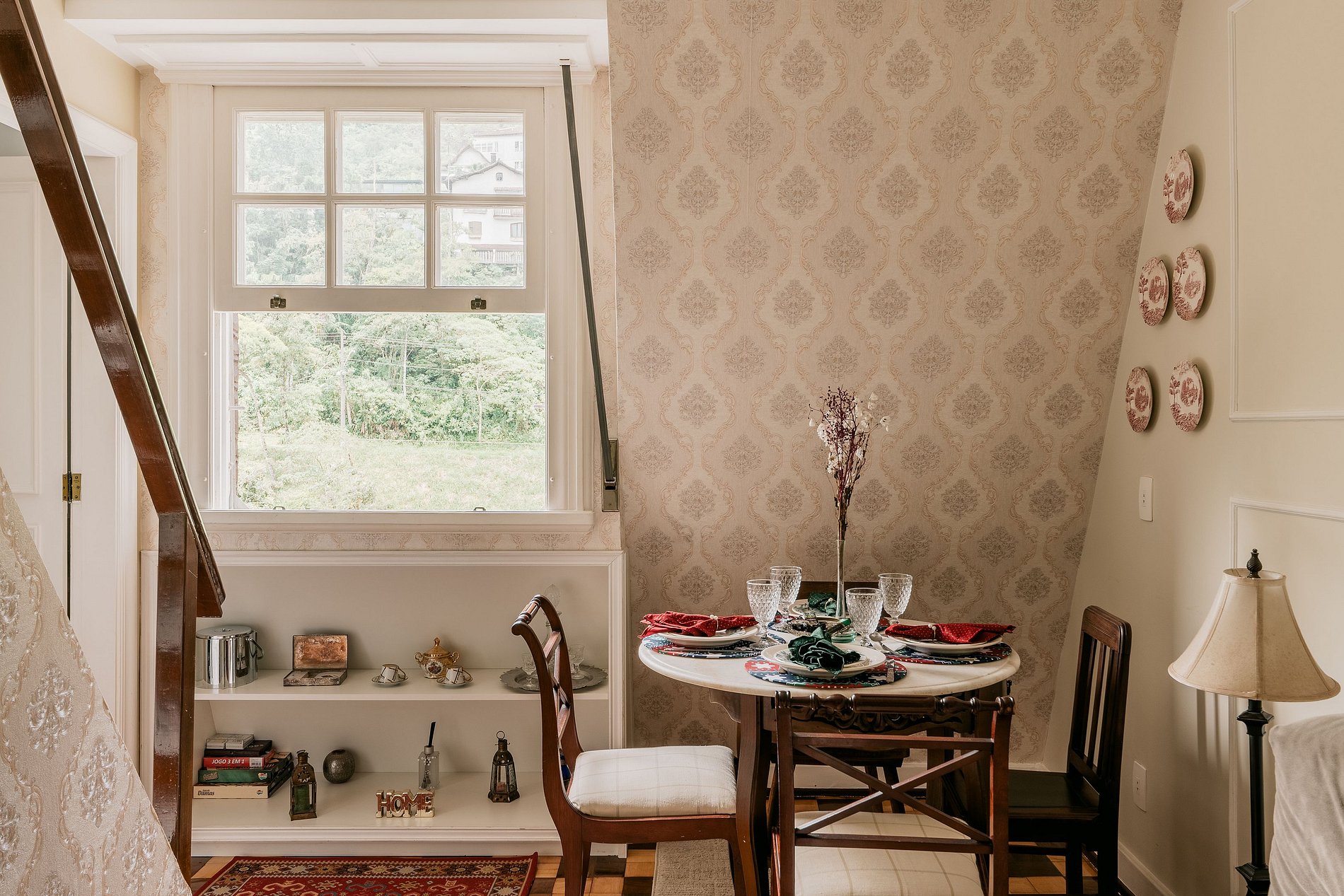 Para acessar o andar superior, uma escada no estilo Santos Dumont (como aquelas presentes em sua casa de Petrópolis), garantindo que cada passo, na subida ou descida, seja dado com elegância. O andar superior oferece um quarto com uma confortável cama Queen, TV de tela plana e um banheiro. Nosso objetivo é proporcionar uma combinação de conforto, praticidade e bom gosto, com toques nostálgicos que adicionam beleza e simplicidade, para que você se sinta verdadeiramente em casa.