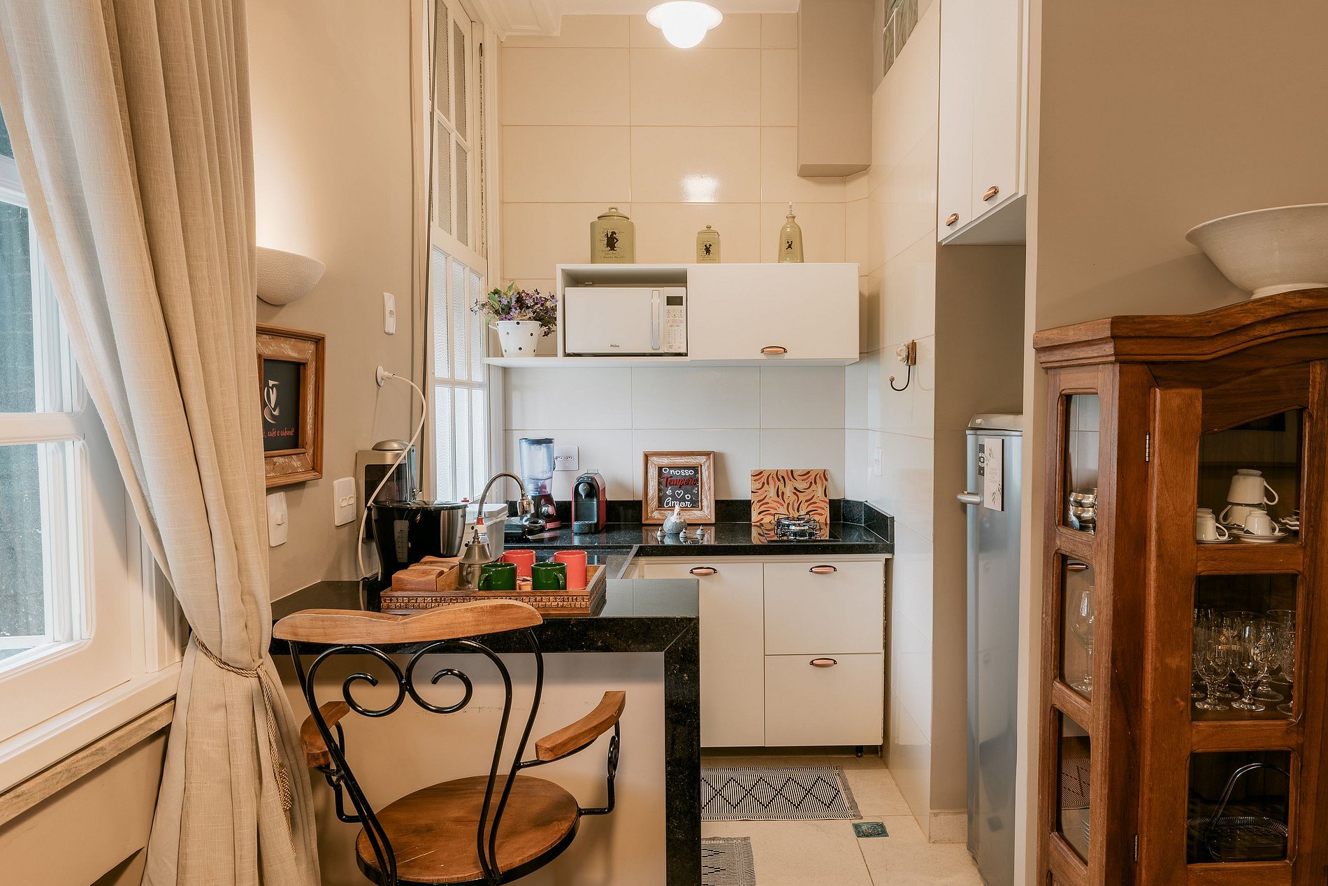 A cozinha é projetada de maneira inteligente e totalmente equipada, contando com balcão, cooktop, torneira com água quente/fria e microondas. Além disso, dispõe de louças, talheres, copos, taças e utensílios, garantindo que você tenha tudo o que precisa para uma estadia incrível.