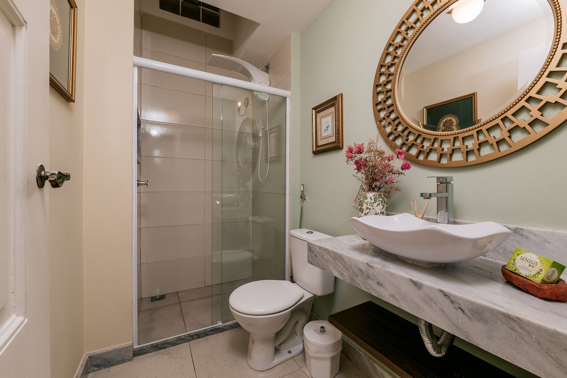 A sala de jantar ocupa a posição junto à janela, proporcionando uma vista espetacular para as montanhas, um adicional maravilhoso. O ambiente de estar é cuidadosamente planejado, com uma TV de 50 polegadas, criando o espaço perfeito para o seu relaxamento. O banheiro é equipado com chuveiro elétrico, box blindex e torneira monocomando, oferecendo água quente e fria conforme sua preferência.