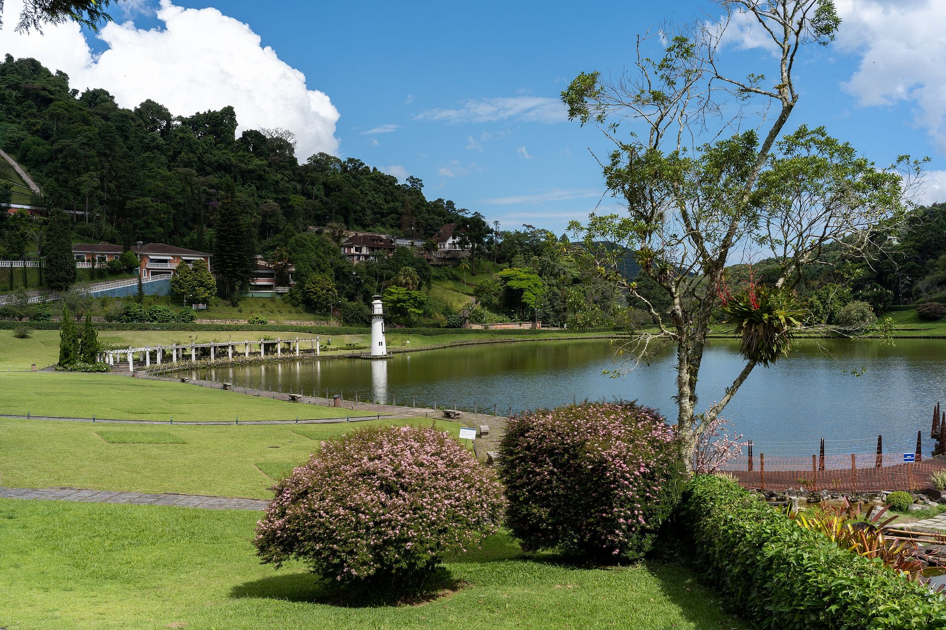 O bairro é charmosamente arborizado, perfeito para agradáveis caminhadas e pedaladas de bicicleta. Em frente ao palácio, encontra-se um lago e um amplo gramado, oferecendo um cenário ideal para fotos e momentos de contemplação junto à natureza. Uma caminhada ao redor do lago é um passeio imperdível, proporcionando ângulos deslumbrantes para fotografias. A paisagem circundante do Palácio Quitandinha é o cartão postal por excelência da cidade de Petrópolis, repleta de Magia Imperial.