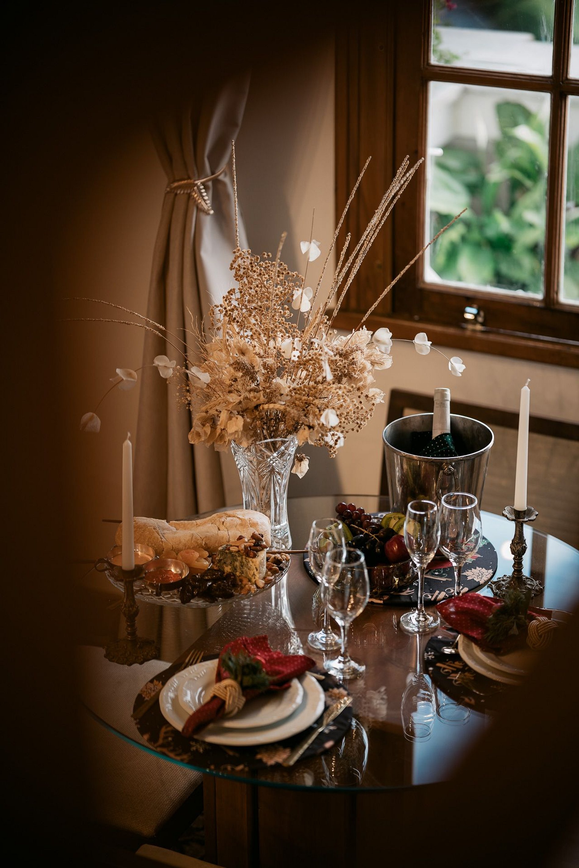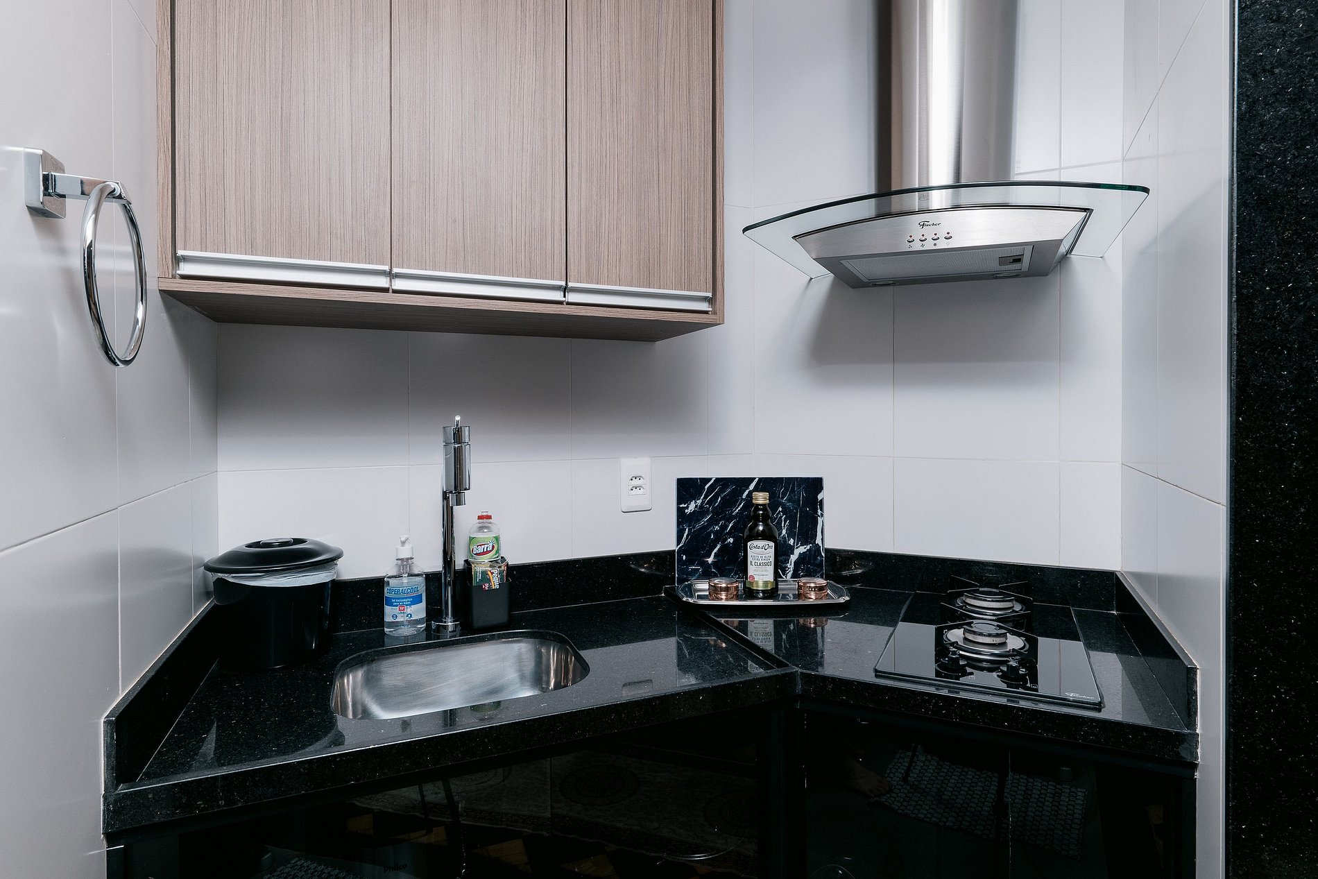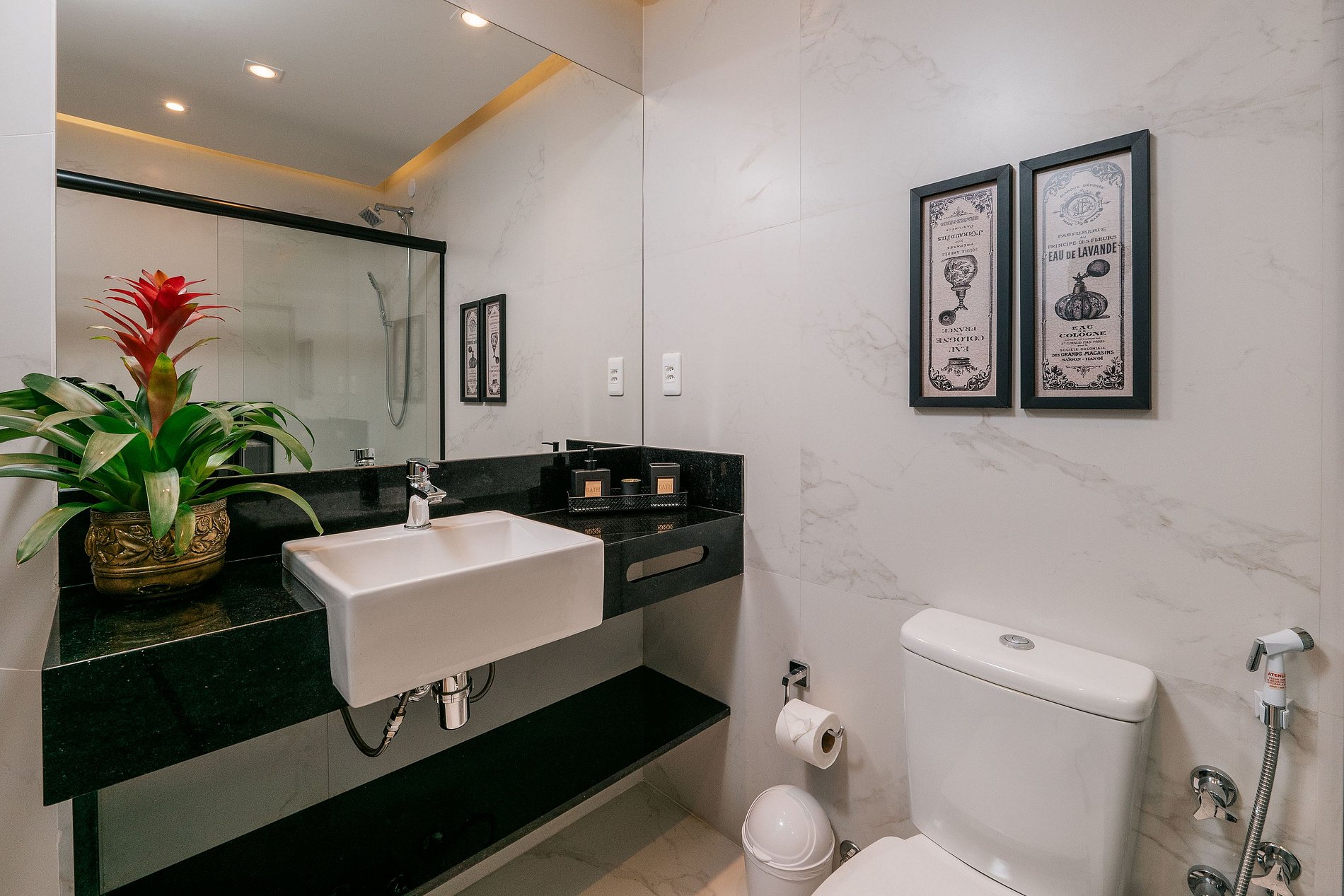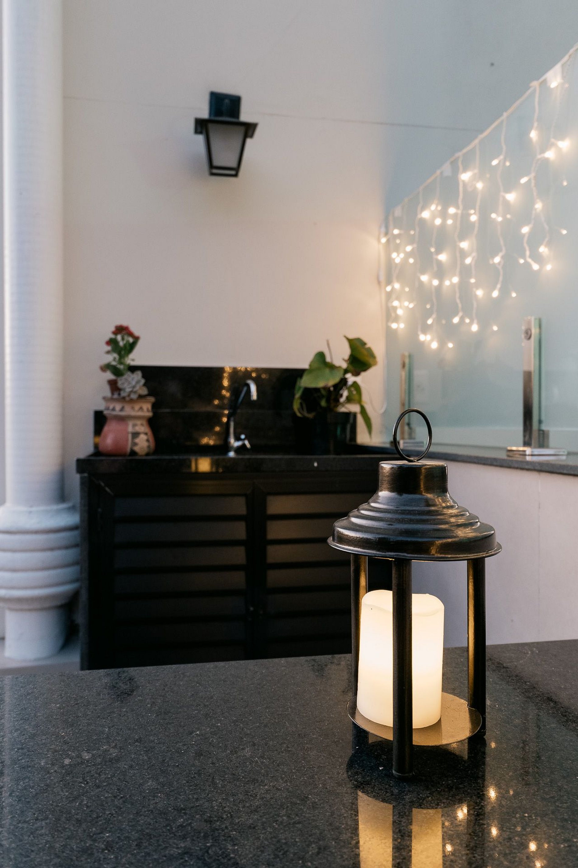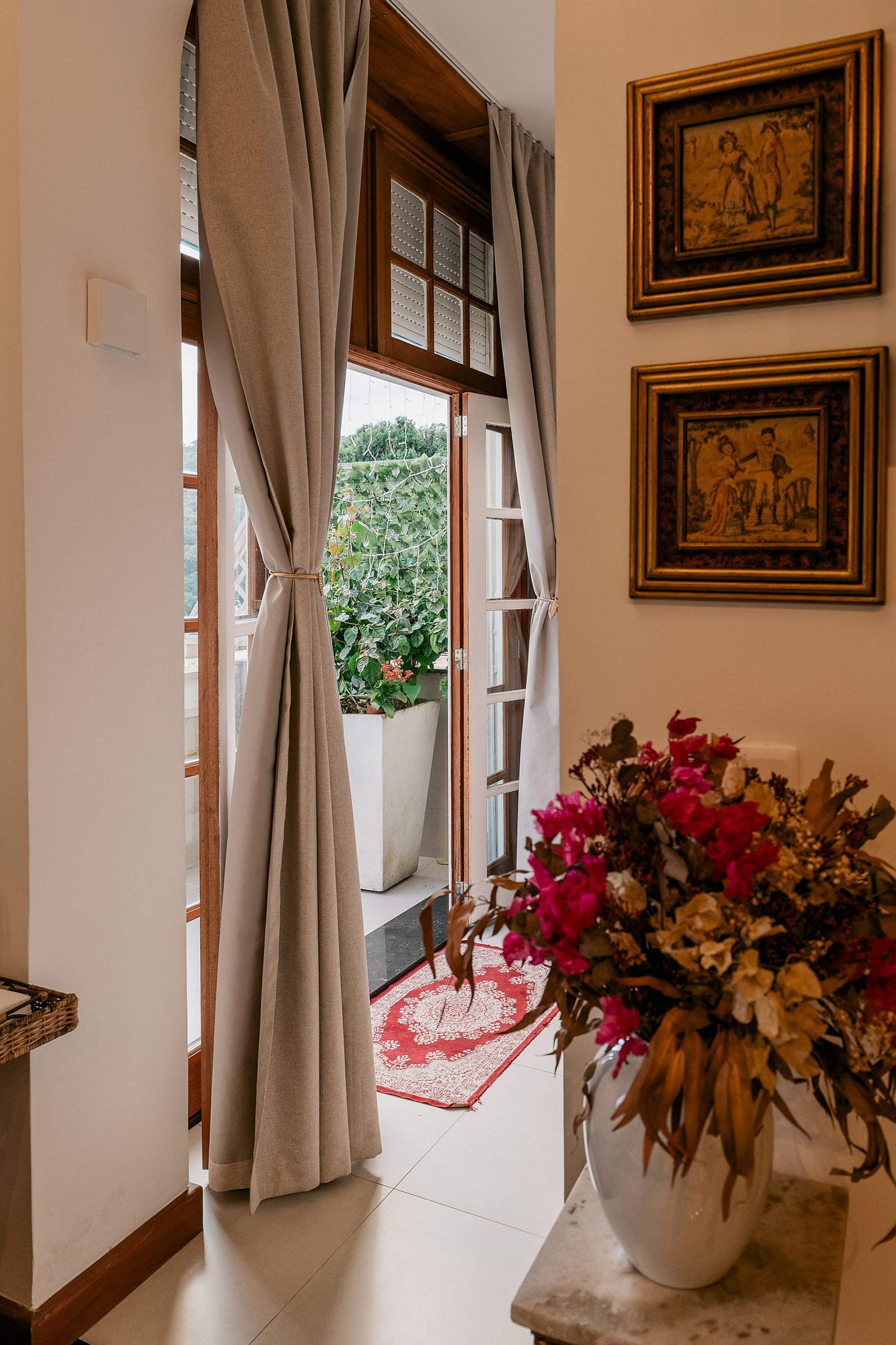 O banheiro, em preto e branco, é clássico e espaçoso, com ducha e torneira de água quente. A cozinha, charmosa e totalmente equipada, proporciona tudo o que você precisa para refeições, chás, drinks e até mesmo um churrasco à beira do lago, com equipamentos e utensílios próprios. Louças, copos, taças e demais itens foram cuidadosamente escolhidos para que você se sinta em casa, com sofisticação e aconchego. Espelhos antigos, quadros, cristais e lustres transformam sua estadia em um momento único e inesquecível.