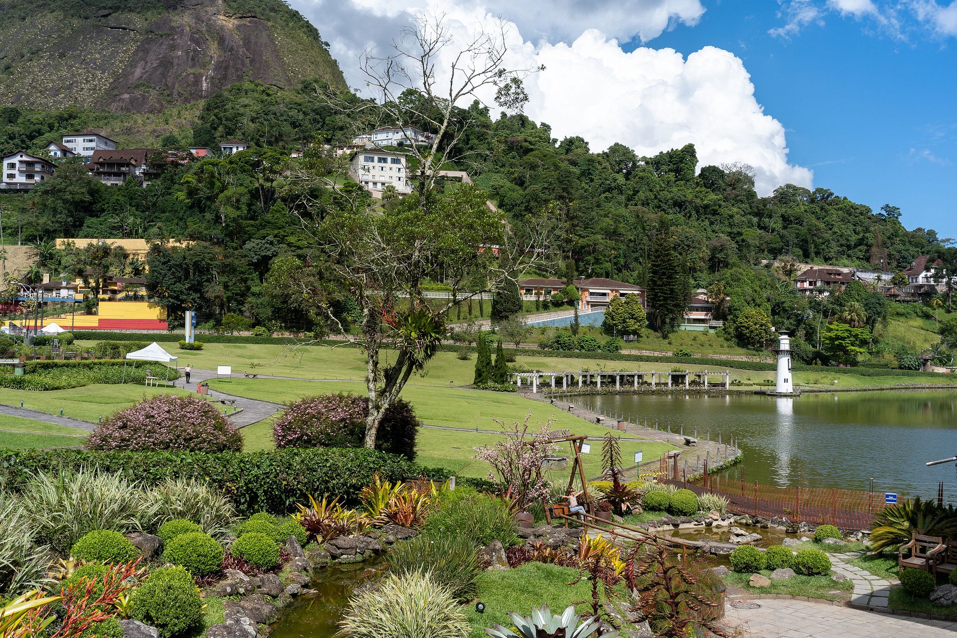 Além disso, o bairro é notavelmente arborizado, proporcionando um ambiente agradável para caminhadas e passeios de bicicleta. Em frente ao palácio, há um lago e um extenso gramado, criando um cenário perfeito para fotos e momentos de contemplação da natureza. Uma caminhada ao redor do lago é uma experiência imperdível, oferecendo ângulos fascinantes para capturar fotos memoráveis. A paisagem ao redor do Palácio Quitandinha é o principal cartão postal da cidade de Petrópolis, envolvendo os visitantes em uma atmosfera de Magia Imperial.
